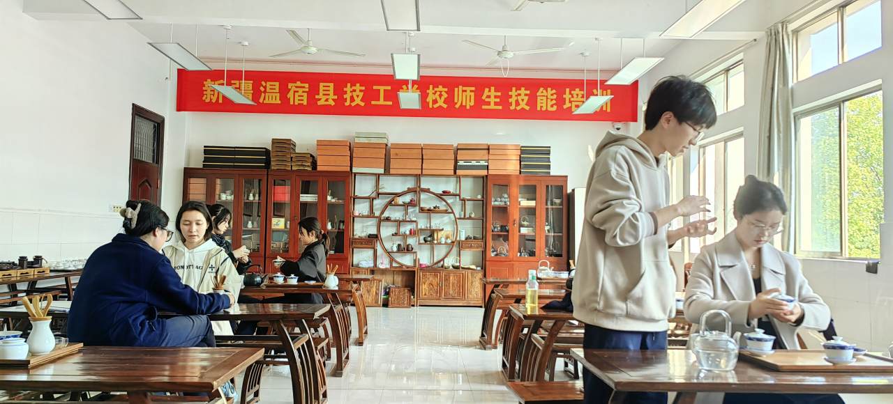 图为:新疆阿克苏地区温宿县技工学校师生在浙江省东阳市职教中心东技校区一同与该校师生共同学习交流茶艺技艺(江凯摄)