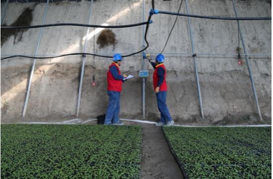 图为:3月18日,国家电网新疆电力天山雪莲(阿克苏乌什)共产党员服务队在英阿瓦提乡贡格拉提(5)村果蔬育苗大棚里检查用电设备。
