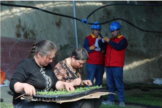 3月18日,在英阿瓦提乡贡格拉提5村果蔬育苗大棚里,菜农正忙着对西红柿幼苗进行管护,定苗、覆土、控温,不远处,国家电网新疆电力天山雪莲(阿克苏乌什)共产党员服务队队员塔依尔·司拉依力正忙着对大棚里的接线进行检查。
