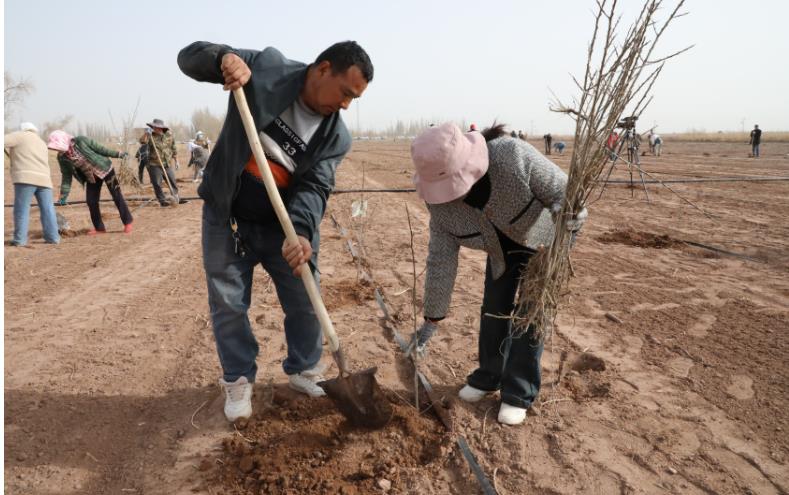 3月19日,在新疆生产建设兵团第一师二团二连的一处灌木林地,职工们正忙着挥锹铲土、深挖树坑、扶苗培土,栽种以沙棘为主的经济林,将灌木林变成特色经济种植基地,拓宽增收致富路。