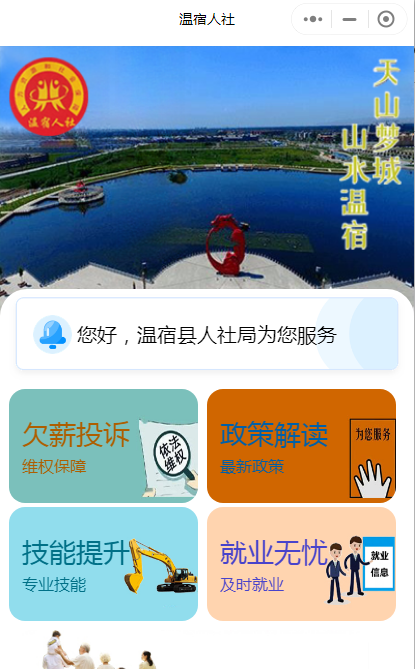 “阿依古扎丽,你看!现在想要找工作的话,可以直接扫码“温宿人社”小程序登录查找心仪的企业和岗位,还可直接与招工企业咨询”“企业想要招员工,也可扫码登记完善招工信息”“农民工讨要工资,可通过扫码实现自身权益维护”“查询个人社保,可直接扫码登录进行查询”“想要学习就业技能,也可扫码了解咨询”……在温宿县各乡(镇)劳动保障所(站)、温宿县政务服务中心、社区、楼宇、工地,都印着“温宿人社”微信小程序的海报随处可见。