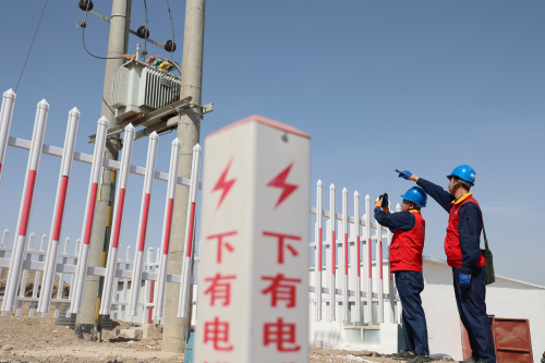 4月11日,国网乌什县供电公司员工安外尔·阿卜拉、安外尔·赛麦提在乌什县阿合雅镇吐曼村设施农业樱桃种植大棚巡视检查用电设备。外力·克依木 摄