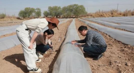 4月15日,在新疆库车市乌恰镇蔬菜新村的甬甜5号甜瓜种植基地,一排排小拱棚整整排满了田地,工作人员们正忙着移栽甜瓜苗。来自宁波市农科院高级农艺师丁伟红不远万里从宁波来到库车,现场为种植户进行详细讲解培训。