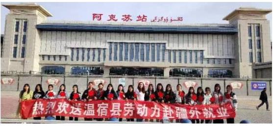 图为:近日,温宿县人社局干部欢送外出就业人员就业,并为他们送上暖心礼包(江凯摄)