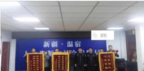 图为:近日,温宿县人社局劳动保障监察大队工作人员为42名农民工工资90余万元信访事项进行化解,群众送锦旗以示感谢(江凯摄)