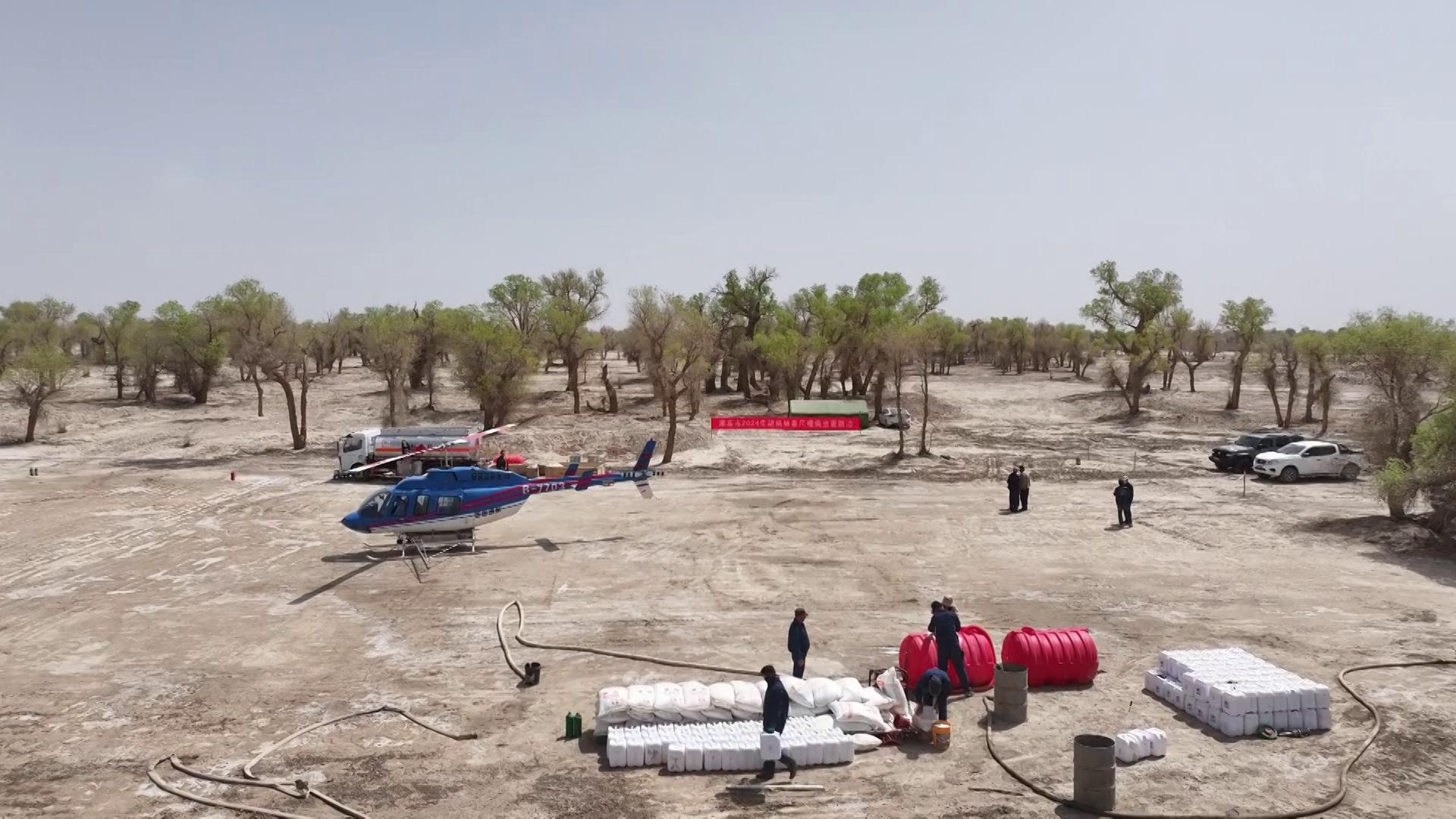 4月21日,在库车市塔里木镇胡杨林区,工作人员正在忙着配制药品并对直升机进行药物装填。随着轰鸣的引擎声响起,满载环保药剂的直升机腾空而起,按照设定路线开始进行飞防作业。