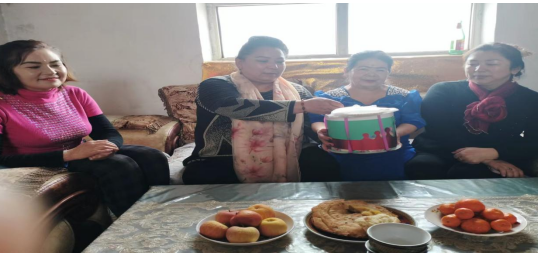 吐尼亚孜汗带着计生办全体工作人员跟随主人来到茶几前,将蛋糕放在茶几上。阿娜尔汗示意客人随意就坐。大家毫不拘束,围坐在一起,不约而同为她唱起生日祝福歌。