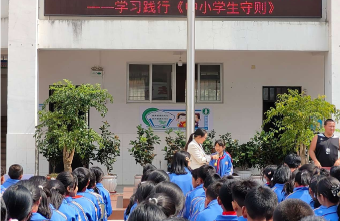 全体师生听歌曲《中小学生守则》拉开活动的序幕,活动中,学校党支部书记、校长张茂书引导学生理解守则的意义、价值以及践行的要求。《中小学生守则》共有九大条,每一条张校长都会以“你怎么做?该怎样做”等问题的形式与学生互动,让学生举手抢答,并给予积极参与抢答的学生一定的奖励。