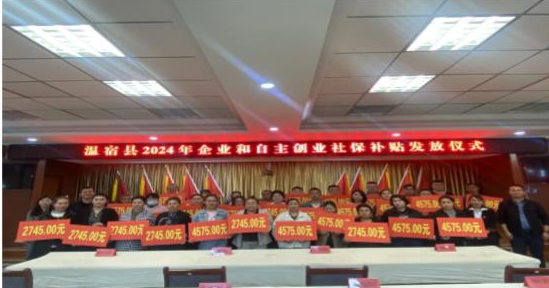 图为:近日,温宿县人社局举行2024年第一季度企业社保补贴和个人自主创业社保补贴集中发放仪式,为符合条件的22家企业和358家自主创业个体发放社保补贴121.51万元(江凯摄)