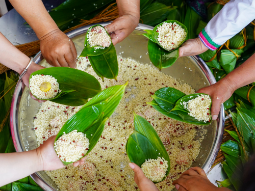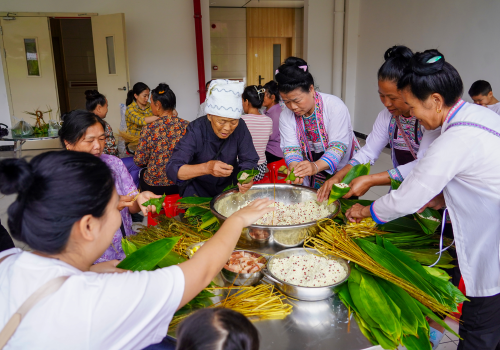 2024年6月9日,群众在从江县中医医院洛香院区参加端午节包粽子比赛。
