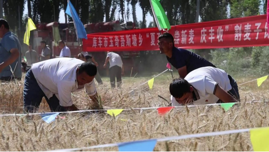夏至到,品麦香。眼下,在新疆库车市广袤田野上,57.2万亩冬麦一片金黄,处处展现着一派繁忙丰收景象。当地村民通过割麦比赛、磨制新麦、分享面食等多种形式庆祝丰收、分享喜悦。