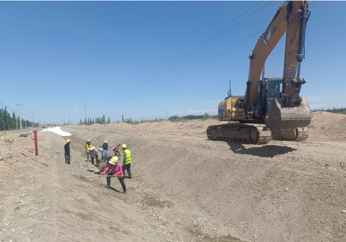 在阿克苏市柳源镇永兴村防渗渠施工现场,大型机械和施工人员正紧张有序地施工作业,一派热火朝天的忙碌景象。