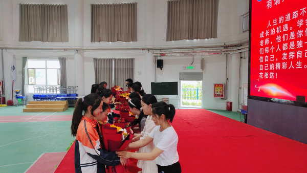 紧接着,优秀毕业生代表张明明作了发言,他以真挚的话语表达了对老师们的深深祝福和不舍,同时也表达了对每位毕业生的美好祝愿。随后,毕业生代表向任课教师们敬献了鲜花,表达对老师们的无限感激之情,真诚的话语和温暖的拥抱,既是对师恩的不舍与难忘,更是对师生情的无限眷恋与怀念。