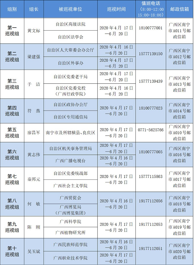 十一届广西壮族自治区党委第十轮巡视进驻一览表