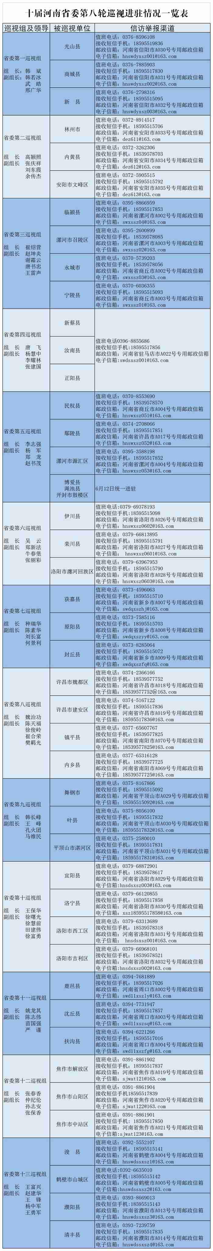 按照河南省委统一部署,十届省委第八轮巡视安排12个巡视组对光山县等40个县(市、区)开展常规巡视;安排1个巡视组对民权县等6个县(区)开展巡视“回头看”。5月6日至10日,43个被巡视单位分别召开巡视工作动员会。据介绍,河南省委第五巡视组对民权县等6个县(区)的巡视“回头看”分两批进驻,除此次已进驻的民权县、鄢陵县、漯河市源汇区外,6月12日将进驻渑池县、博爱县和开封市鼓楼区。
