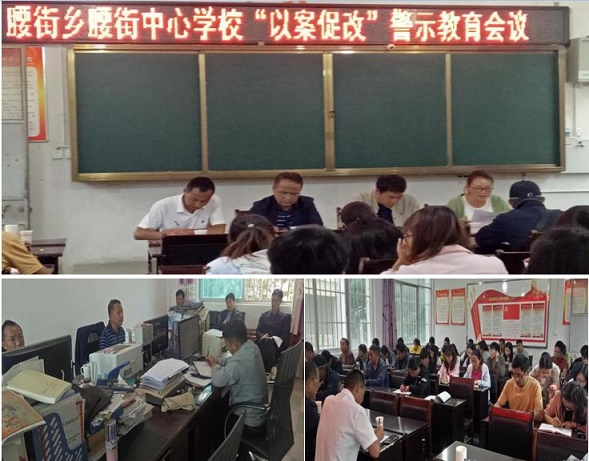 清风网讯(凤庆县腰街乡教育总支委员会 ; 罗凤军) 为不折不扣落实好党总支全面从严治党主体责任,深刻剖析凤庆县教育系统严重违纪违法问题,深入分析本系统、本单位近年来发生的违纪违法案件暴露出的问题,做好“以案促改”后半篇文章,以案为鉴、以案为戒、以案明纪、以案促改,推进正本清源,教育和引导广大党员干部、教职工切实增强法纪意识,知敬畏、存戒惧、守底线,涵养教育体育系统风清气正的政治生态。中共腰街乡教育党总支委员会统一部署安排,于2020年6月8日至9日,组织教育办全体人员及中小学校长、腰街中学党员干部职工、腰街中心学校党员干部职工,开展了3场次“以案促改”警示教育活动,受教育党员教师累计达85人次。