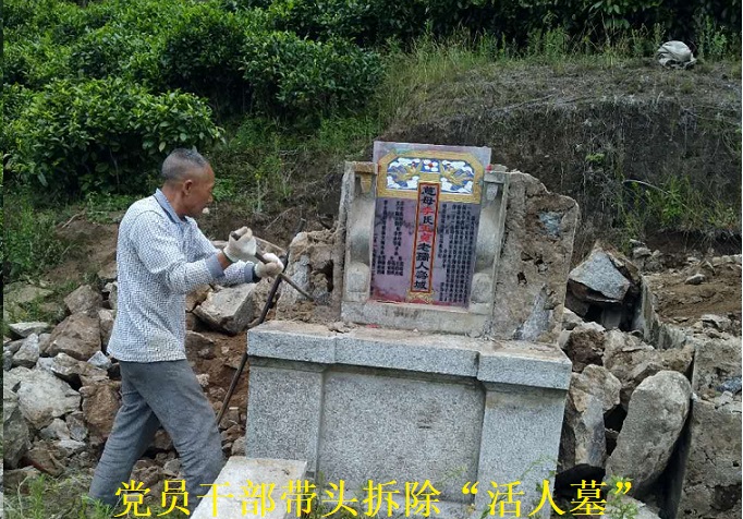 示范带动,在整改落实上做好减法。党员干部率先垂范,带头移风易俗,自觉成为弘扬社会新风、革除陈规陋习的推动者、执行者与示范者,并主动接受监督。大力开展全面拆除国家公职人员和共产党员本人及直系亲属“活人墓”专项清理整治工作,乡人民政府干部职工带头与党委书记签订《殡葬改革承诺书》,党员身体力行与所在党组织负责人签订《殡葬改革承诺书》,平掉自家的坟头,带动影响周围的群众投入到殡葬改革中来,切实发挥了党员干部的乘数效应。截至目前,共签订《殡葬改革承诺书》136份,排查出活人墓1814冢,拆除活人墓9冢。