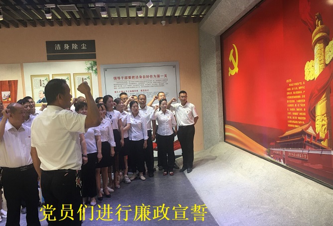在参观完展厅最后一个篇章,面对鲜红的党旗,66名党员举起右拳,党委副书记、校长陈鹏黎带领大家进行了集体廉政宣誓,庄严的誓词,时刻提醒每位党员受警醒、明底线、知敬畏。