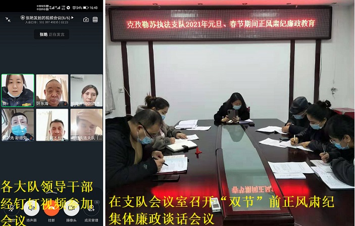 清风网讯(克孜勒苏执法支队:再努尔·特外库力)近日,克孜勒苏执法支队采取钉钉视频会议方式召开“元旦 春节”期间集体廉政谈话,深入推进“双节”期间严明纪律正风肃纪工作,所属各大队、各科室负责同志和关键岗位干部参加会议。此次集体廉政谈话,既是落实2021年元旦春节期间正风肃纪工作安排的重要举措,也是传达警示自治区纪委监委、克州纪委监委、自治区交通运输厅系统曝光违反中央八项规定精神典型问题的再学习再教育。