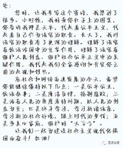 为创新廉政教育方式,宜阳法院充分发挥家属促廉助廉的积极作用,通过家属助廉承诺书、亲情寄语等方式,集教育引导、真情感化于一体,引导干警家属当好“廉内助”、常吹“耳边风”,用亲情来鼓舞干警守护廉洁之门、构筑廉洁防线,为反腐倡廉增加亲情助力。爱人的嘱托、父母对儿女的厚望、子女对父母的期待,一张饱含情意浓浓的照片,一篇充满谆谆嘱咐的寄语,朴实无华、平凡而质朴、温馨而感人,无不表达着家属们的关爱和嘱托,如同一把清正廉洁的钢尺,时刻丈量着每一名干警的行为与得失。