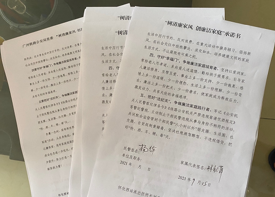 在当天的“承诺书”签订活动中,怀西所党支部各成员分赴民警家中,将“承诺书”亲手递到民警家属的手中。经过一天的工作,全所民警家属全部签订了《树清廉家风创廉洁家庭承诺书》。