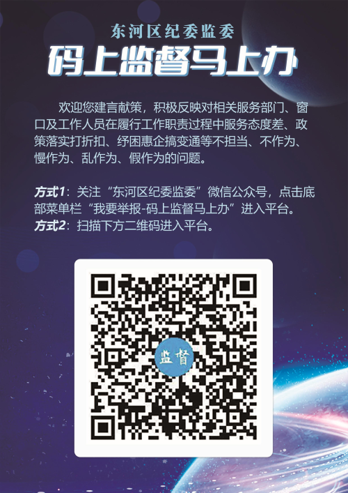 近日,东河区纪委监委印发《关于拓展升级“码上监督马上办”进一步优化营商环境的通知》,在全区各类大中小型企业、商场超市、农贸市场、文化体育娱乐场所及传统服务业经营个体中宣传推广“码上监督马上办”,广泛收集意见建议和受理信访举报,进一步强化营商环境监督执纪工作,以硬核举措助力优化“包你满意”“包你放心”营商环境。