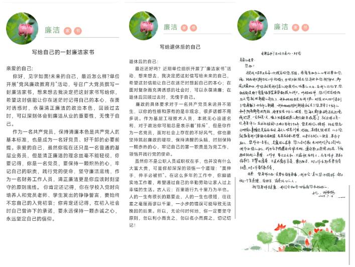 活动中,全体党员以传统的书信方式,为父母、妻子、老公及未来的自己书写“家书”,支部共收到廉洁家书17封。每一封家书都饱含深情,不仅紧扣着“尊廉、倡廉、助廉”的家庭美德,也向自己的亲属表达了严格执法执纪、知廉倡廉守廉的决心,并时刻提醒亲属们远离腐败之风,永葆廉洁之心,珍惜岗位荣誉,坚守职业底线,始终不越红线、不碰高压线,共同构筑幸福美满家庭。