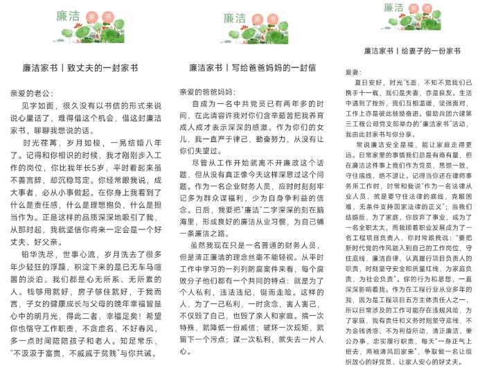 为深入贯彻落实党的二十大精神,进一步推动全面从严治党向纵深发展,切实增强广大党员干部及其家属的廉洁自律意识,近日,第三工程公司党支部组织全体党员干部开展“一封家书助清廉”活动,旨在引导全体干部家属们当好廉洁“贤内助”,多吹廉洁“枕边风”,以家助廉、以家促廉。