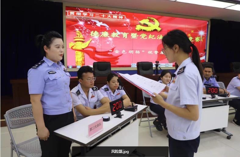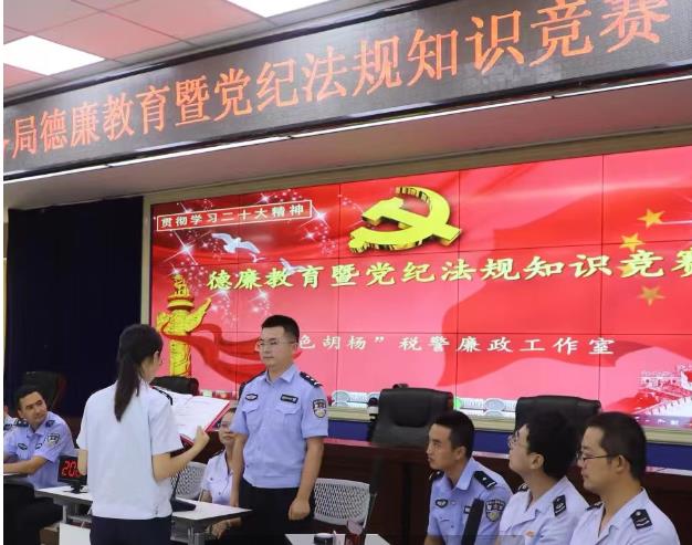 知识竞赛分为必答题、抢答题、风险题、附加题四个环节,竞赛内容融知识性、趣味性、教育性于一体。竞赛中,参赛队员各个精神饱满、踊跃竞答。尤其在抢答题和风险题环节,台下观赛党员干部也纷纷摩拳擦掌,为各自的代表队加油鼓气,竞赛气氛热烈而紧张。在比知识储备和速度的激烈角逐中,促使党纪法规更好地入脑入心,展现出“金色胡杨”税警廉政工作室成员积极学习的热情和良好精神面貌。