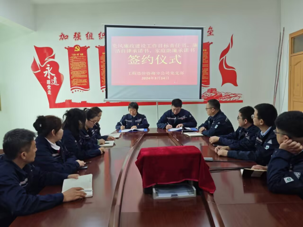 新疆阿拉尔新城建筑有限责任公司工程造价咨询分公司高度重视党风廉政建设和反腐败工作,致力于构建良好的政治生态。近日由分公司党支部书记与每一位党员干部签定了党风廉政建设工作目标责任书、廉洁自律承诺书、家庭助廉承诺书,明确了分公司党风廉政建设和反腐败工作的方向和要求,旨在促进基层党组织和党员干部严格遵守党的纪律,做到廉洁从政,为企业健康、稳定、可持续发展提供坚强的政治保障。