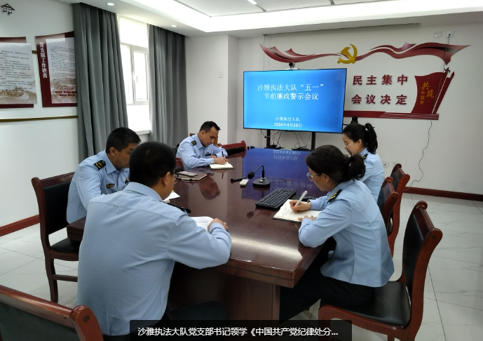 为进一步严格落实中央八项规定精神,切实加强党员干部作风建设,不断增强干部职工红线意识,筑牢廉洁自基。4月29日,阿克苏执法支队沙雅执法大队组织开展“五一”节前廉政警示教育会议,大队全体人员参加会议。