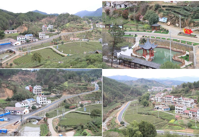 雨后的茶山,空气清新,视野空旷,春意正浓。四周的小山为雨雾缠绕,白墙红瓦蓝窗的民居镶嵌其间,满坡茶叶青翠欲滴,桃树枝上花开簇簇……