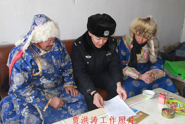 锡林浩特车站派出所管辖线路长达200余公里,点多、面广、线长,自然环境复杂,邻近线路两侧牧户繁多、牲畜多,群众安全意识差,加上护网基础条件差,线路安全保卫工作难度较大。贾洪涛依据工作实际,独创了“标语入村、传单入手、宣传入心”爱路护路宣传模式,他经常带着警务协勤人员和巡防员深入铁路沿线大牲畜养殖户、五残人员、废品收购点及重点牧户家中进行“面对面”宣传和签约回访,引用周边发生的实际案例,进行法制宣传,教育引导广大农牧民自觉爱路护路。