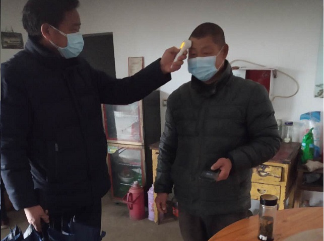 担当践行使命。刘建忠同志说:“危急关头,共产党员要带头上。”他是这样说的,也是这样做的。哪里有困难,哪里就有他的足迹;哪里有危险,哪里就有他的身影。测量体温有潜在的危险,他不畏危险、“疫”往无前。每天带领工作人员进行入户检查、登记、量体温等工作,做到不漏一户,不漏一人,不断一天。2月15日漫天大雪,天寒地冻,他仍然战斗在卡点上,站立在雪中,满身雪花,诚然是一位边防站岗的威武战士。