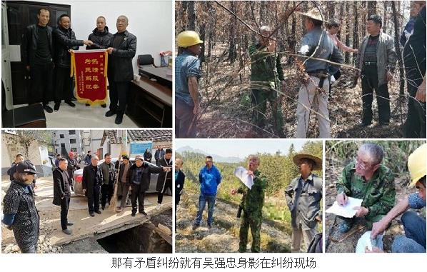 2020年吴强忠成功调处上叶村二起生产队与生产队界至、生产队又与农户发生山林界至较复杂的山林纠纷。2020年4月30日天刚蒙蒙亮,吴强忠便走上羊肠小道,爬山勘察该争议山场的林貌和地形,并结合双方持有的林权证上登记四至界至与现场林貌、地貌先进行制作了争议山场草图,并经双方当事人在场确认争议标的后签字,当场由双方当事人指界,将争议标的进行与双方当事人释法明理后,当中午12点在该山场上成功调处二起山林争议,并当场为双方当事人制作了调解协议书。