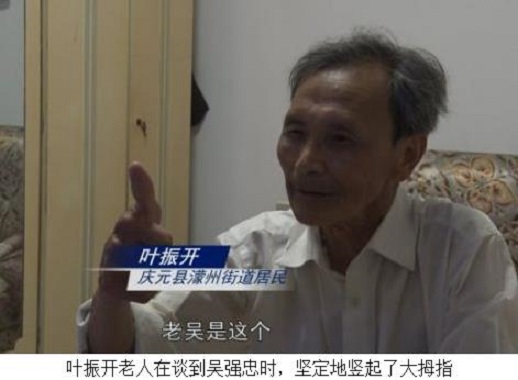 当您看了浙江、丽水、庆元电视台热播:吴强忠:包公志 为民情、道德模范吴强忠:公平公正调解为百姓解纠纷去烦恼。您就知道当地老百姓对他是如何“德高望重”的评价,在丽水市委组织部、庆元县委组织部在拍摄吴强忠专题党建视频时,记者采访了八十多岁老人叶振开,叶振开老人竖起大拇指夸赞不绝口:“老吴是这个人(伸母指),是按照习近平总书记(要求)办事的。”