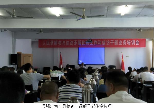 庆元县矛盾中心于2020年6月份邀请了全国司法行政系统二级英雄模范、全国模范人民调解员、浙江省敬业奉献道德模范、浙江省首届特级人民调解员吴强忠进驻县矛盾中心“强忠调解室”,这是庆元县坚持因地制宜,突出特色。立足本地矛盾纠纷实际状况和调解员擅长领域、发挥专业特长,积极打造具特色的调解工作品牌,推进引领全县人民调解工作的ー个亮点。