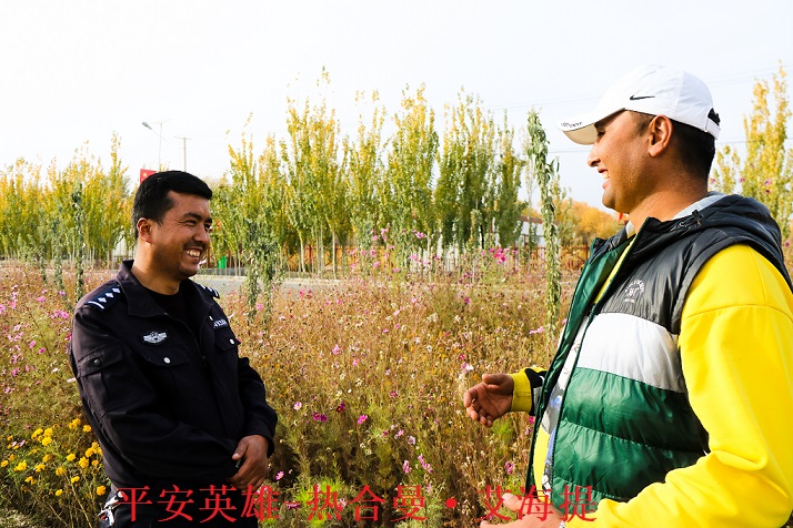 十年前的哈德墩镇没有直达的道路,来这里要坐渡船、穿越胡杨林,人烟稀少却也物产丰富。哈德墩派出所也只是一个小小的卡点,热合曼·艾海提秉着“一夫当关万夫莫开”的勇气和决心,一个人坚定地留在了这里。睡在临时搭建的帐篷里,喝着咸涩的地下水,一脚踩下去看不见鞋子的碱土并没有击退这个年轻人的内心。他挨家挨户地深入胡杨林去熟悉辖区情况,寻找居无定所的牧羊群众,帮助需要帮助的群众和动物,成为他十年来从未停止的事业。太阳晒黑了他的面庞,塔里木河水和大地馕丰盈了他的筋骨,他像胡杨一样,在这片盐碱地里扎根生长,从卡点民警到警务室民警再到派出所民警,热合曼·艾海提见证了公安事业在这片胡杨林中的茁壮成长。2018年,哈德墩派出所正式挂牌成立,2019年,热合曼·艾海提因工作出色被组织任命为哈德墩派出所副所长。