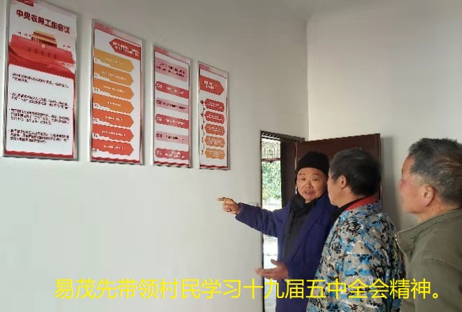 为了让村民早日走上致富路,助力乡村振兴,易茂先在村里率先响应金家铺镇党委政府关于“能人回乡、老干回乡,助力乡村振兴”的倡议,发起成立了乡村振兴学习小组,带领村民宣传学习十九届五中全会精神;为村民出谋划策,排忧解难。