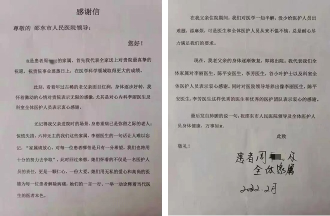 清风网讯(通讯员:李湘兵、 申秀梅 、 李芳 ) “此刻,看着年过古稀的老父亲面色红润,身体逐步好转,我怀着激动的心情对贵院表示无限的感激……”这是近日患者周大爷的家属写的一封感谢信,字里行间流露出他对湖南省邵东市人民医院心内一区医护人员由衷的敬佩和感激。
