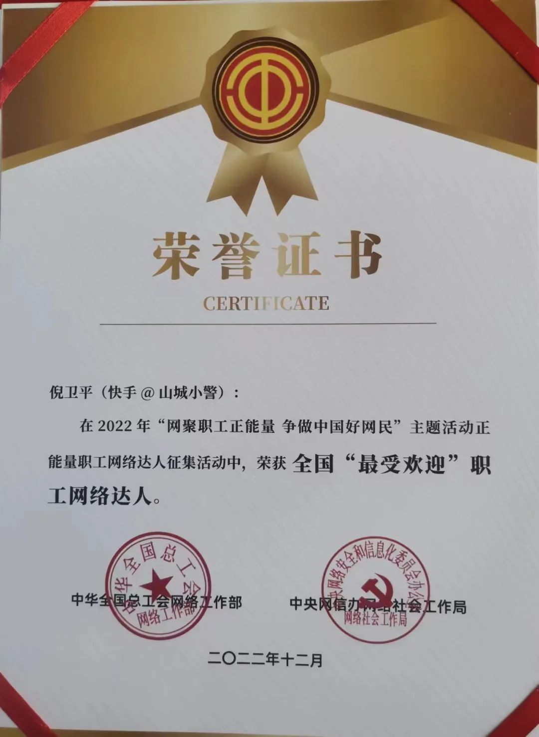 在支队领导支持和同事们的帮助下,交管支队报送的快手号“山城小警”(平台账号ID: shancheng-110)运营者倪卫平同志荣获中华全国总工会、中央网信办“全国最受欢迎”正能量职工网络达人奖项。