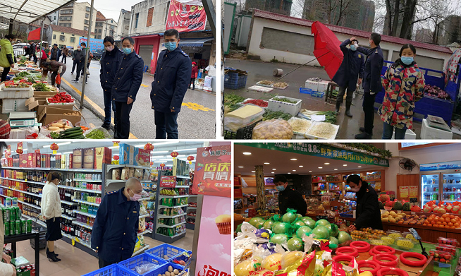 针对已开放的马路市场,分局采取“四定”措施,一是定时间。将开放时间固定为每天上午7点-10点,下午3点半-6点两个时间段;二是定地段。在天灯、长檀社区,月欣、阁子市菜市场旁指定专门地段,设置规定范围,不得延伸到主次干道两边,不得影响消防通道;三是定人员。我部门与城管、社区人员组成联合队伍,对各“马路市场”进行巡查;四是定防护。要求每名卖菜摊主必须戴口罩和手套,避免交叉感染管理;市场交易结束后,及时进行清扫保洁和消毒,同时增加测温频次,每天上午和下午分别对各卖菜摊主进行测温登记。