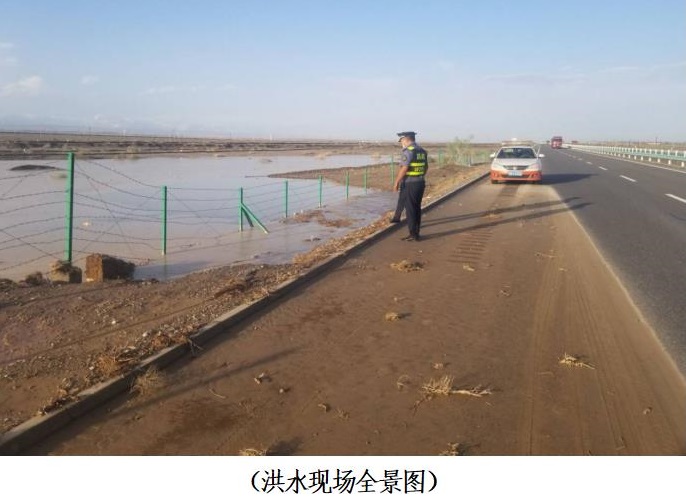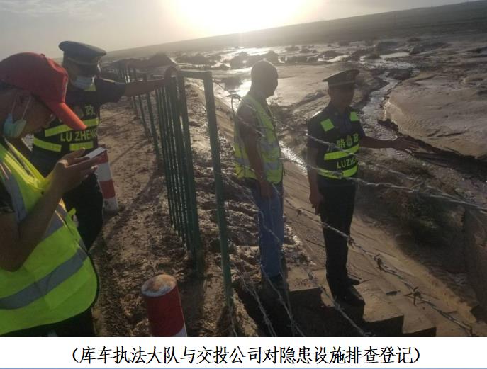 清风网讯(阿克苏执法支队库车执法大队 :鲁提甫拉·夏米西 /阿地里江·艾尼瓦尔)7月23日下午18时30许,库车执法大队接到交警部门险情电话:辖区高速公路G3012线K576至K572+800米路段受短时强降雨影响,突发洪水险情。库车执法大队立即启动汛期应急处置预案,派出5名执法人员,2辆执法车辆同交投公司库阿分公司赶赴现场。