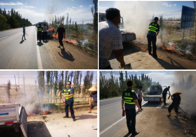 清风网讯(乌什执法大队:安尼卡尔·艾尼瓦尔、丰舍)2020年9月4日12时15分,乌什执法大队3名执法人员在S306线巡查至K5+500米处时,发现正在乌什县往阿克苏方向行驶中的车辆新N8B838的小型普通货车装载的货物冒烟起火,驾驶员未察觉车辆货物正在自燃。我大队执法人员迅速下车,指挥该车辆靠边停车,车身浓烟弥漫且火势有蔓延的趋势,会有可能引起加气罐爆炸的危险,情况十分紧急。我大队人员立刻取出随车携带的灭火器对燃烧的货物进行灭火,将已着火和未着火的货物快速分离,保证货车的安全同时组织人员在前、后方安全范围内摆放安全锥桶,疏导交通,维护现场通行秩序。经过半小时多的时间,在执法法人员和驾驶员的共同努力下最终被完全扑灭,且并未造成太大的财产损失。