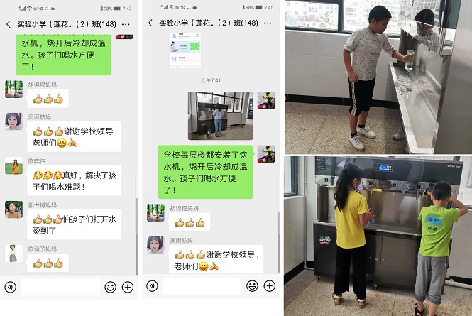 直饮水机安装后,各班班主任及时向学生宣传直饮水机使用和注意事项:不要拥挤,要排队等候; 按“绿色按钮”接温开水饮用,接完水后要及时关掉开关按钮,不能浪费水……孩子们在老师的教育下,都能按要求去做。学校饮水机的配备,解决了以前人多饮水机少的问题,学生可以“任性”喝水了!同时满足了教师和学生能喝上干净水的愿望,提高了饮用水的级别,为学生身心健康提供了保证,特别是为即将到来的冬季,为学生的学校学习生活又增添了一丝丝温暖!