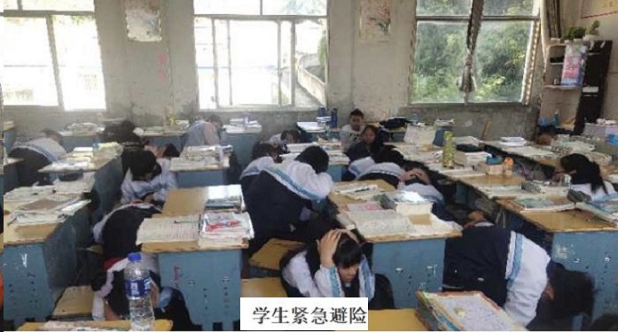 9月8日上午9时10分,防空警报响起,正在上课的老师迅速按照突发事件应急预案引导学生进行避险。学生双手抱头,用书包保护头部,躲到各自的课桌下或课桌旁,蜷曲身体,降低身体重心,最后一排靠里的同学面向墙,蹲在墙角处。