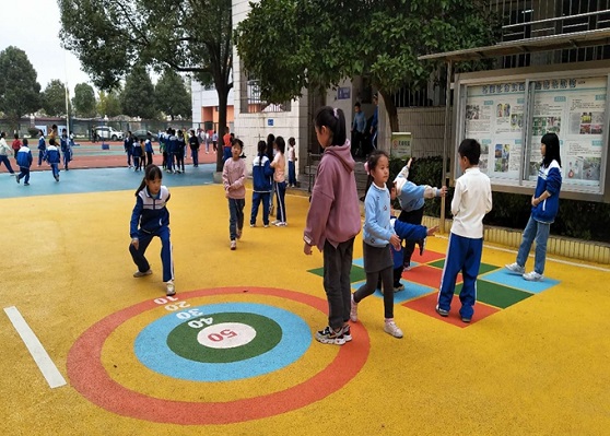仔细测量、精心设计、抓紧施工……当时,为了赶在2020年开学前夕改造如期完工,该校负责人带领着新城团队从早到晚守在学校,全力保障工程顺利进行。2020下学期,整个学校路面又划分为几大板块,刷上橙、黄、红、蓝、绿等油漆。课余,新城美术教研组的几位老师利用休息时间设计,在地面画上各种游戏图案。