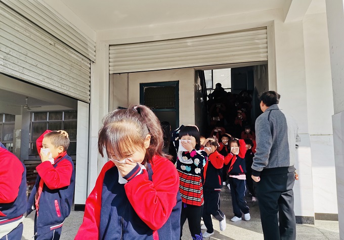 9点50分,随着消防报警声的响起,各班主任、各楼层指挥人员迅速到达指定地点,沉着冷静地指挥学生用湿毛巾捂住口、鼻,尽量将身体放低,从安全疏散通道紧急撤离教学楼。全体师生在指定时间内安全、快速、有序地疏散到了学校操场。