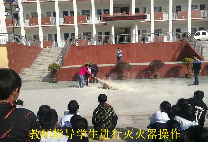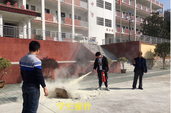在操场各班按照要求,严肃认真的听着涂八亿、胡梦文两位老师讲解灭火器的使用方法,在观看老师示范操作后,分别有男、女学生,宿管,门卫到台前进行实际操作,以到达掌握灭火器的使用方法。