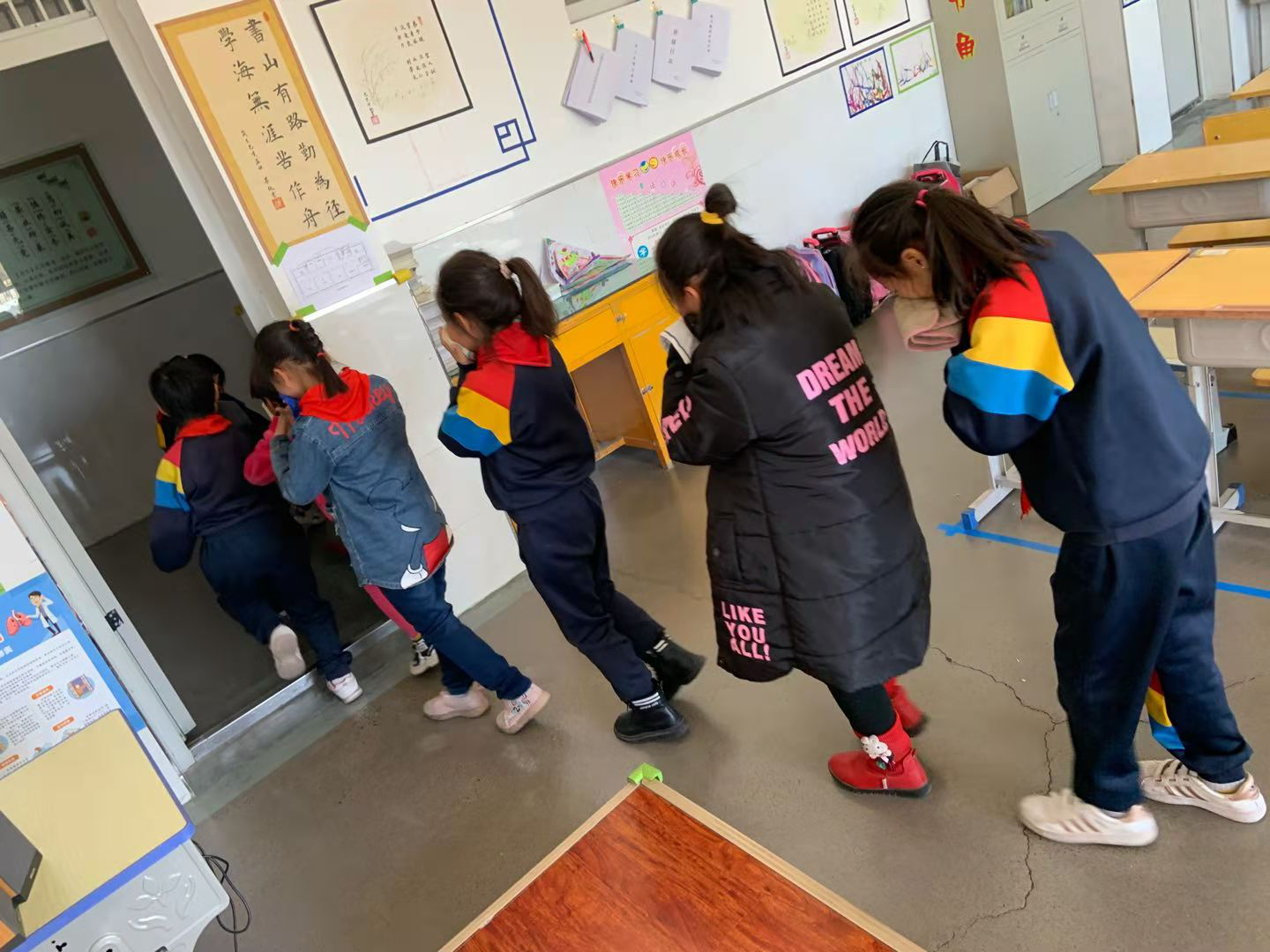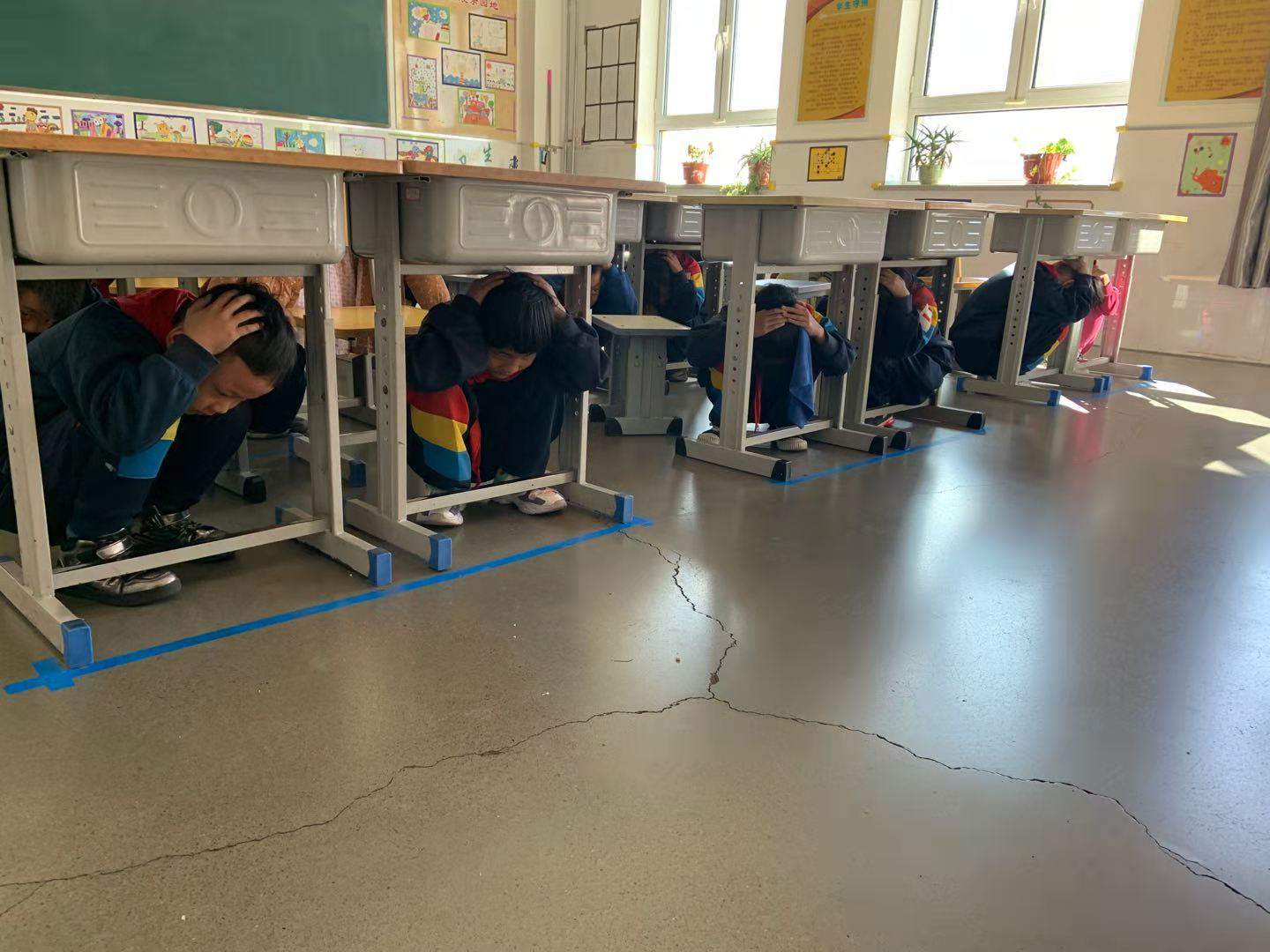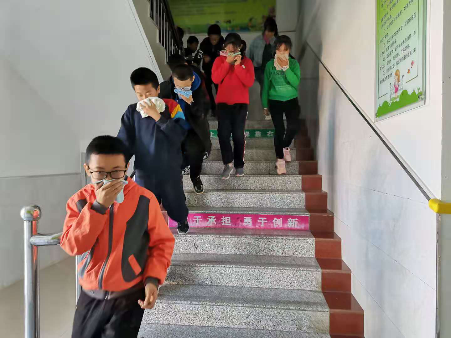 演习中。防火演练,火灾警报响起时,各班班主任及负责教师按照既定路线,迅速带领学生下楼,呈一路纵队向操场快走或跑步前进。防震演练,随着地震警报的响起,各班同学有序、及时地进行躲避。